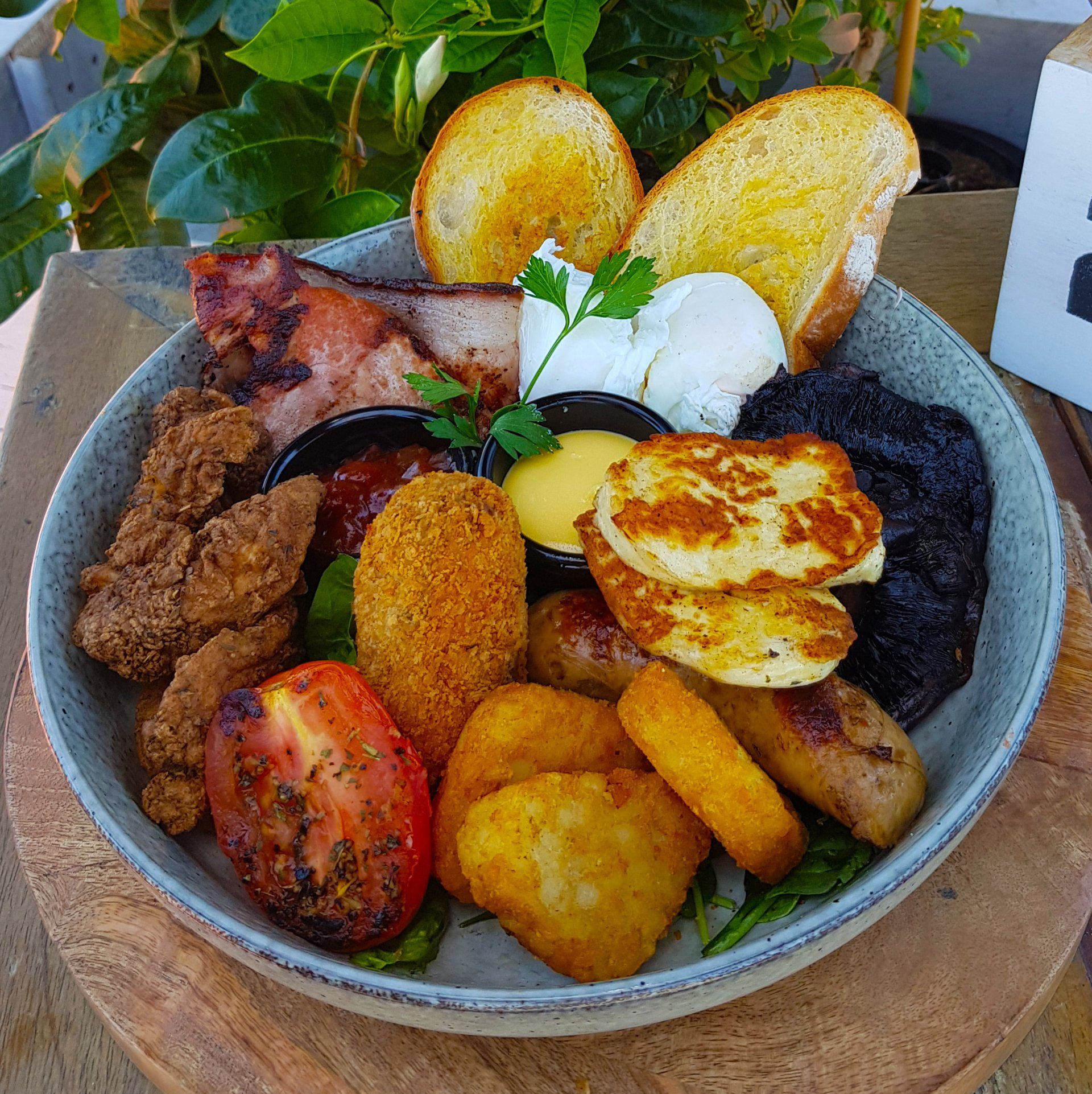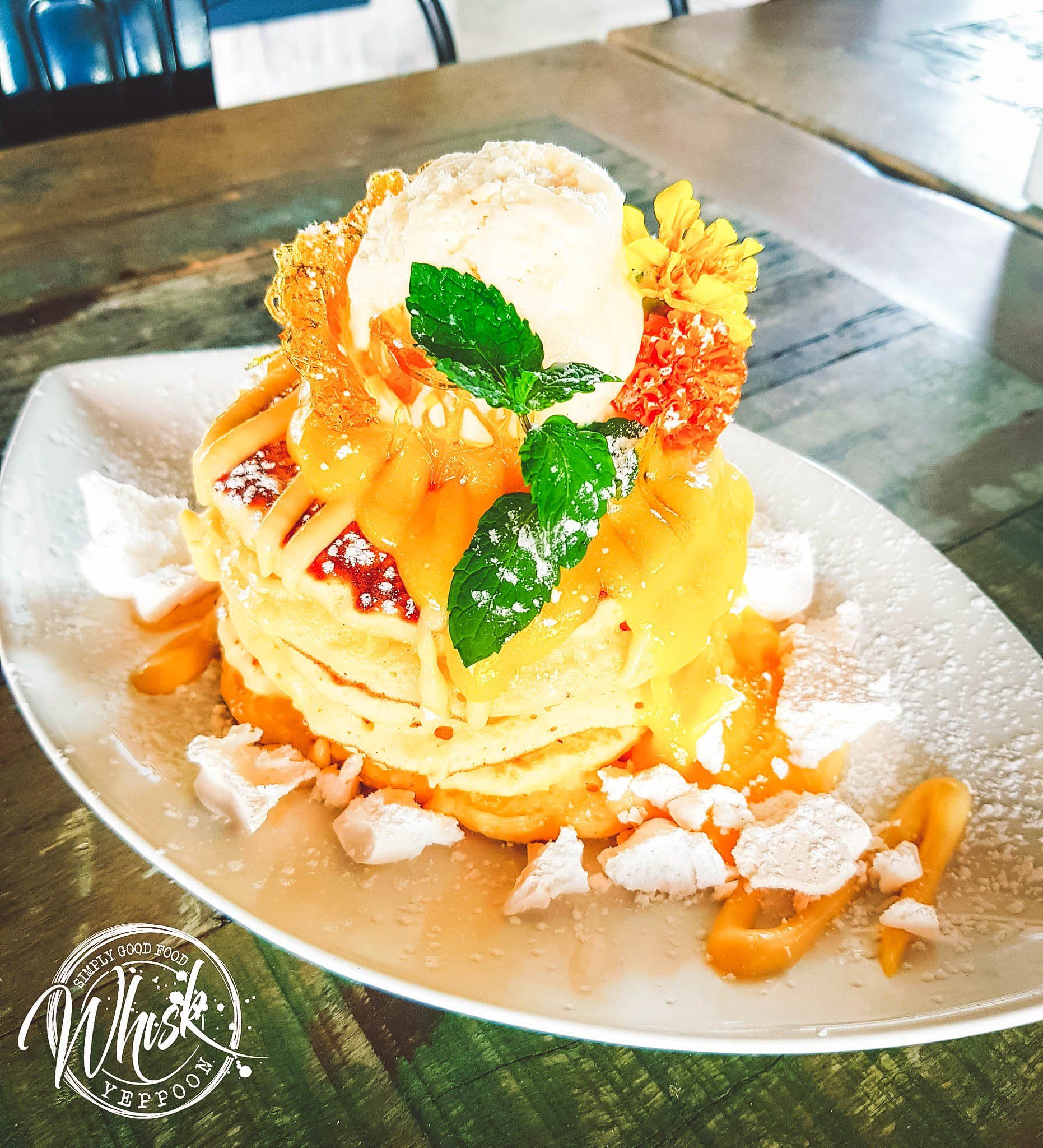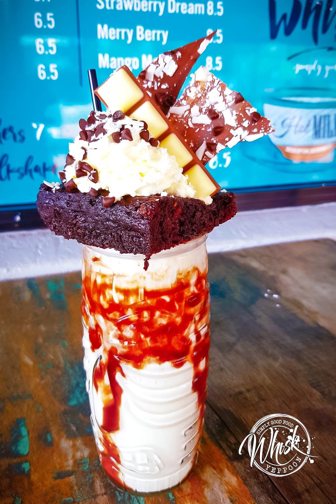 White and milk choc shake, topped with cream, waffle cone, fairy floss, freckle shards and freckles