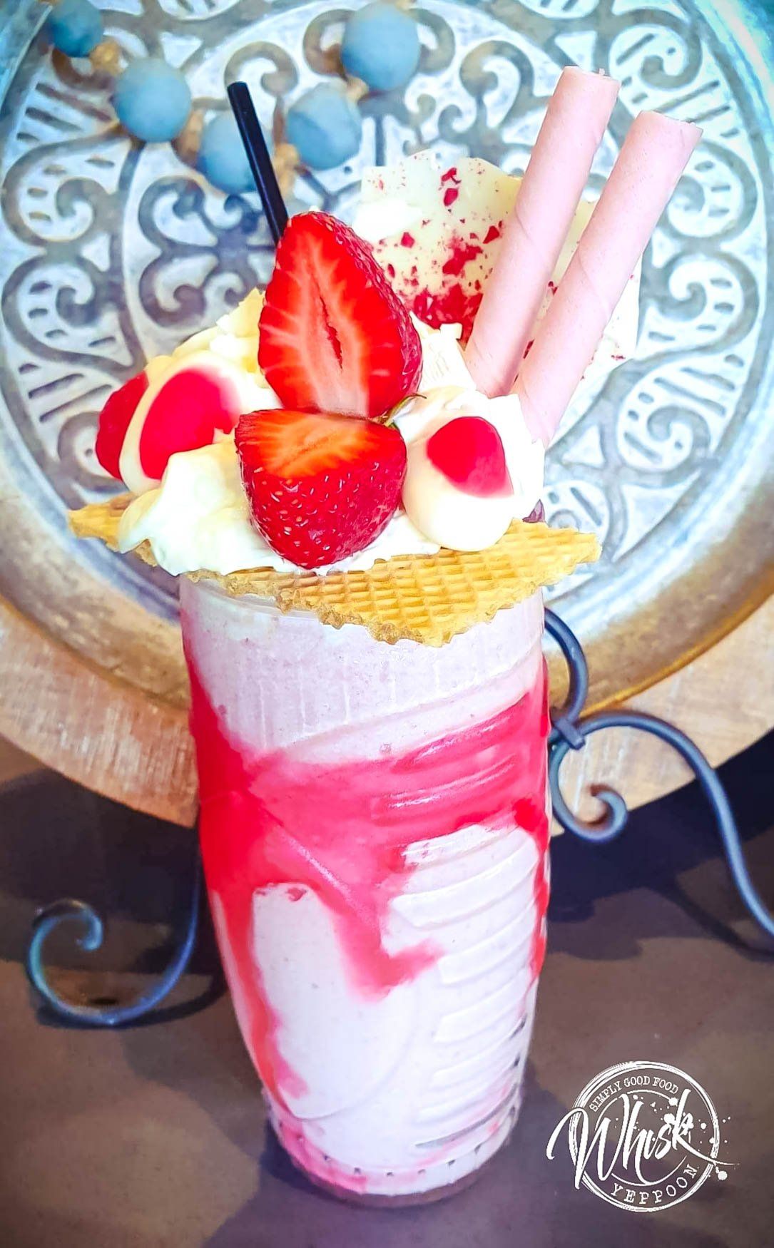 Strawberry, malt and white choc shake topped with cream, wafer slice, white choc shard, strawberry creams & strawberry